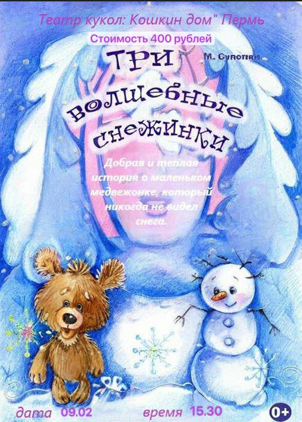 Рады сообщить ,что 9 февраля в 15:30 к нам в гости приезжает театр со спектаклем «Три волшебные снежинки» 2+.